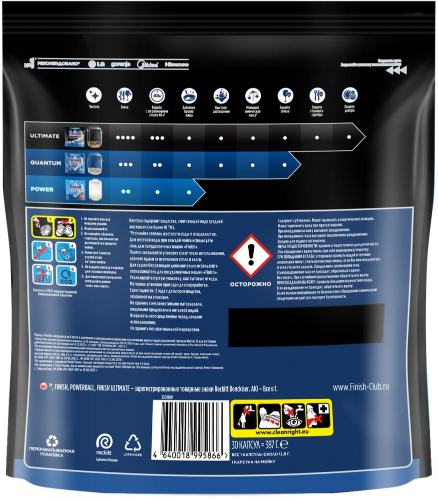 • оболочка капсул Ultimate состоит из биоразлагаемой, 100% растворимой в воде пленки, которую не нужно удалять перед использованием. Не разрывайте пленку перед использованием, чтобы не допустить вытекание компонентов;