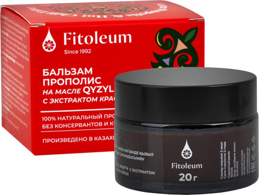 Бальзам Прополис на масле Кызыл май + с экстрактом красного жгучего перца — лечебная разогревающая мазь для снятия боли в мышцах и суставах, при заболеваниях опорно-двигательного аппарата (при хронических болях, связанных с артрозом, артритом, остеохондрозом и радикулитом), при восстановлении после травм (при растяжении, ушибах, вывихе, чтобы ускорить рассасывание синяков и снять остаточные боли), для снятия мышечного напряжения (помогает снять дискомфорт, напряжение, крепатура), при неврите, для профилактики переохлаждения и растяжения мышц перед нагрузкой (подходит для массажа и согревающего эффекта). Комбинация прополиса, масла Кызыл май +, созданного компанией Фитолеум по оригинальной технологии из 8 лекарственных трав, и жгучего красного перца эффективно уменьшает воспаление, боль, отёк, ускоряет восстановление после травм, улучшает кровообращение и снимает мышечное напряжение. Не содержит гормонов, антибиотиков, консервантов и красителей.