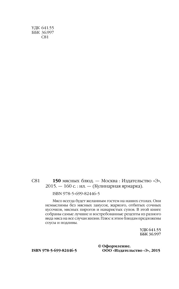 150 мясных блюдВ данный момент этот товар отсутствует в продаже. Возможно, у нас найдется аналогичный или похожий товар здесь. Серия: Кулинарная ярмарка Мясо всегда будет желанным гостем на наших столах. Они не мыслимы без мясных закусок, жаркого, отбитых сочных кусочков, мясных пирогов и наваристых супов. В этой книге собраны самые лучшие и востребованные рецепты из разного вида мяса на все случаи жизни. Плюс к этим блюдам предложены соусы и подливы. |