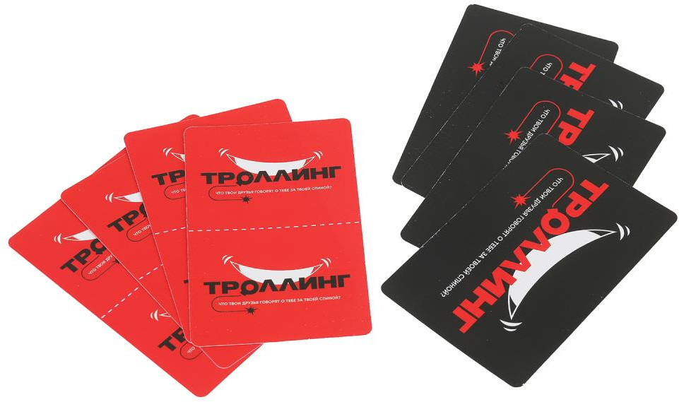 Умные игры Игра карточная «Троллинг»В данный момент этот товар отсутствует в продаже. Возможно, у нас найдется аналогичный или похожий товар здесь. Карточная игра «Троллинг» ТМ «Умные игры» — настольная игра для весёлой компании: узнай, что твои друзья говорят о тебе за твоей спиной! «Троллинг» — весёлая игра для вечеринок и семейных посиделок! В наборе игры 40 карт с каверзными вопросами и забавными персонажами. Задача игроков — угадать, кого из них выбрал ведущий при ответе на не самые простые, но жизненные вопросы. Узнайте, что друзья думают о вас на самом деле! |