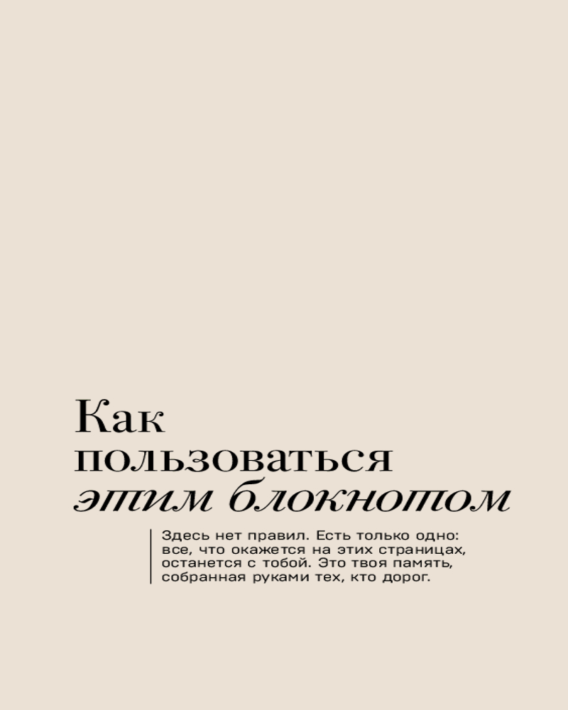 💳 Оплатить за товар можно при получении 🇰🇿 Есть бесплатная доставка по Казахстану от 1 дня 🎁 Копите бонусы с каждой покупки Серия: Письменные практики. Блокноты для честного диалога с собой «Твои слова — моя память». Блокнот, который станет летописью вашего сердца и ваших близких. У каждого из нас есть люди, чьи слова согревают, чьи советы меняют всё, чье присутствие — подарок. Но время стирает детали, а яркие моменты остаются лишь в памяти. Подарите им и себе не просто блокнот, а уникальное пространство для диалога, творчества и вечных воспоминаний. |
