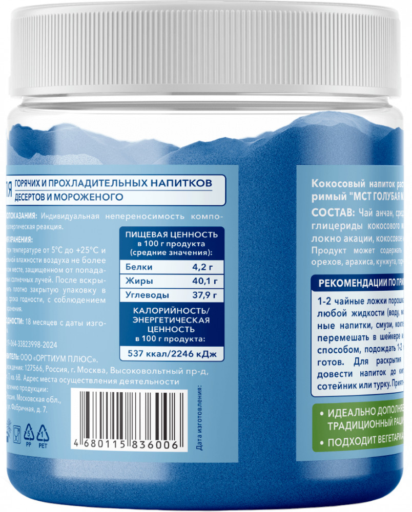 Оргтиум Кокосовый напиток растворимый «МСТ голубая матча»
