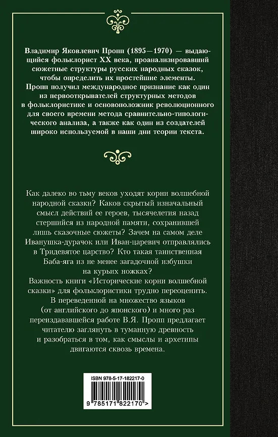 💳 Оплатить за товар можно при получении 🇰🇿 Есть бесплатная доставка по Казахстану от 1 дня 🎁 Копите бонусы с каждой покупки Серия: Лучшая мировая классика Как далеко во тьму веков уходят корни волшебной народной сказки? Каков скрытый изначальный смысл действий ее героев, тысячелетия назад стершийся из народной памяти, сохранившей лишь сказочные сюжеты? Зачем на самом деле Иванушка-дурачок или Иван-царевич отправлялись в Тридевятое царство? Кто такая таинственная Баба-яга из не менее загадочной избушки на курьих ножках? |