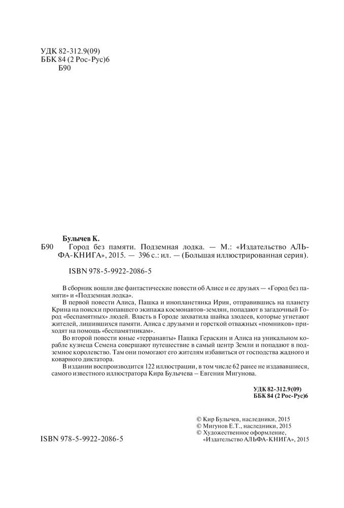 В данный момент этот товар отсутствует в продаже. Возможно, у нас найдется аналогичный или похожий товар здесь. Серия: Большая иллюстрированная серия В сборник вошли две фантастические повести об Алисе и ее друзьях — «Город без памяти» и «Подземная лодка».