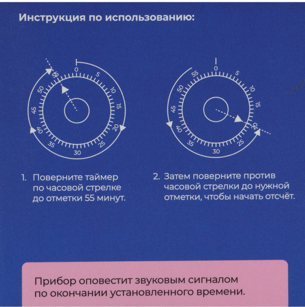 Диапазон работы: 1 час. Выберите нужное время и заводите таймер. Когда время закончится, прибор издаст громкий звук.