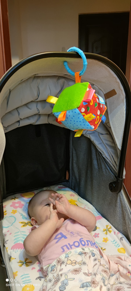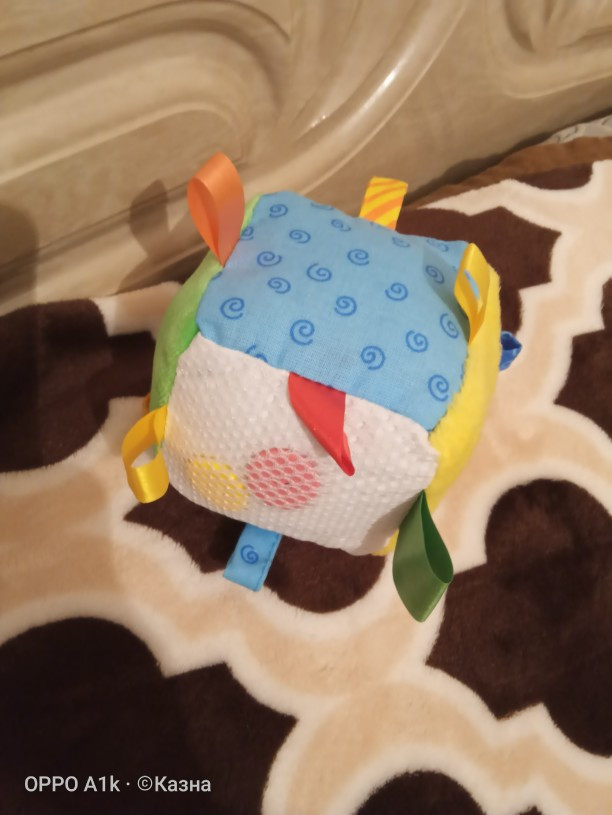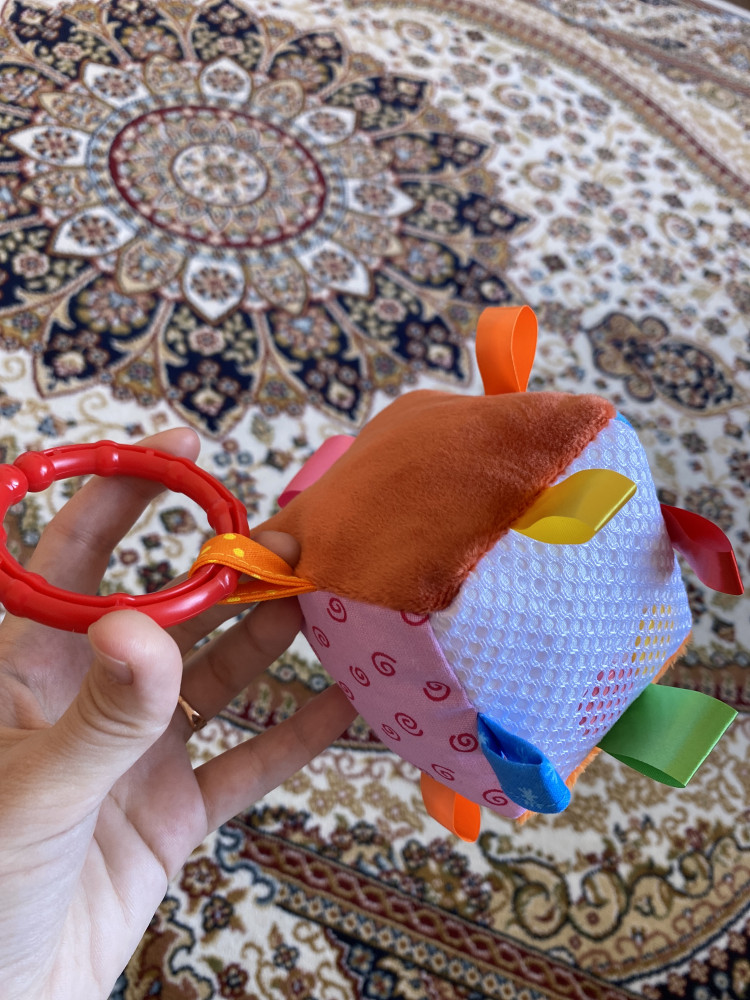 Купила когда ребенку было 3 месяца, и в 7 месяцев интерес не пропал. Каждая сторона имеет разный цвет и фактуру, за петельки можно цепляться пальчиками, кубик звенит когда его трясешь.