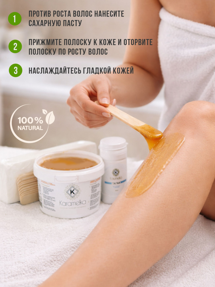Karamelka Набор для шугарингаВ данный момент этот товар отсутствует в продаже. Возможно, у нас найдется аналогичный или похожий товар здесь. Набор для шугаринга Karamelka — готовое решение для эффективного и бережного удаления волос в домашних условиях. В комплект входит сахарная паста, тальк, деревянные шпатели и полоски для депиляции, что позволяет сразу приступить к процедуре без дополнительных покупок. Натуральный состав пасты (глюкоза, фруктоза, очищенная вода и сок лимона) обеспечивает безопасное использование даже для чувствительной кожи, снижая риск раздражения. Паста мягко захватывает волоски и удаляет их по росту, делая кожу гладкой надолго. Удобный формат 550 г подходит как для новичков, так и для регулярного применения. Идеально для зоны ног, рук, подмышек и бикини. Шугаринг Karamelka — это гладкая кожа, экономия времени и салонный результат у вас дома. |