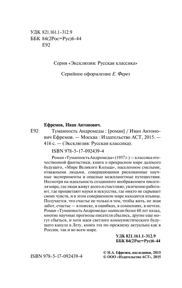 Серия: Эксклюзив: Русская классика Роман «Туманность Андромеды» (1957 г.) — классика отечественной фантастики, книга о прекрасном мире далекого будущего, «Мире Великого Кольца», населенном смелыми, отважными людьми, совершающими рискованные научные эксперименты и опасные межпланетные путешествия.