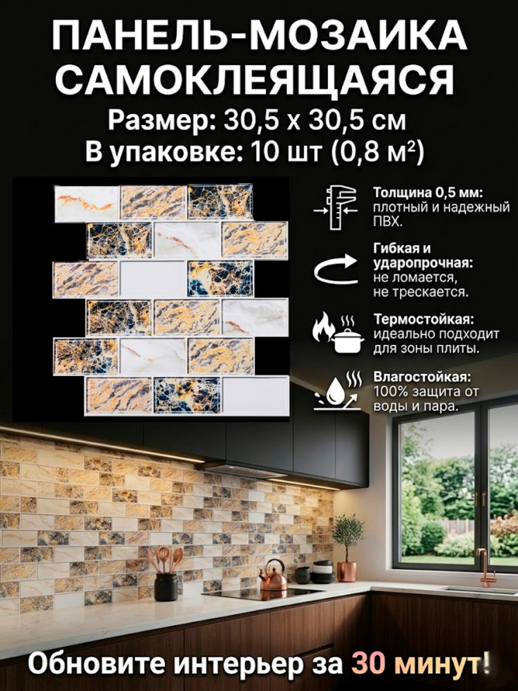 Самоклеящаяся панель-мозаика для кухни и ванной (10 шт, 0,8 м²)