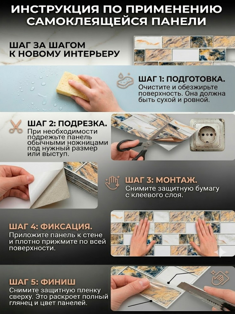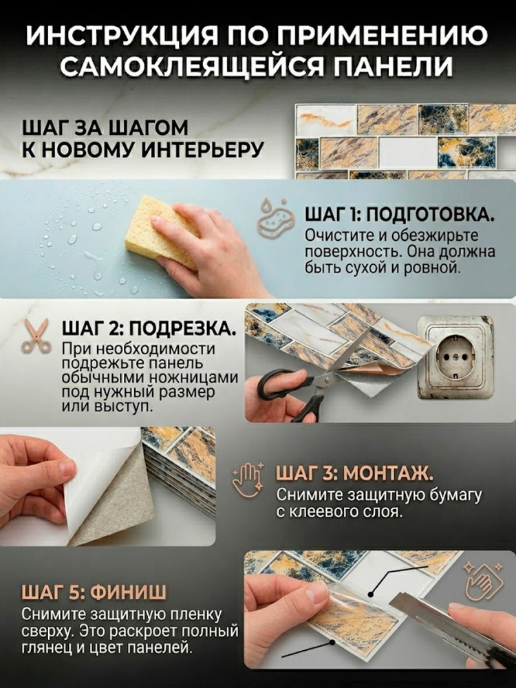 Мечтаете о стильном кухонном фартуке или обновлении стен в ванной, но пугает пыль, шум и стоимость плиточных работ? Наши самоклеящиеся 3D панели из ПВХ — это идеальное решение для быстрого и бюджетного ремонта своими руками. Благодаря реалистичной текстуре мрамора с глянцевым финишем, поверхность выглядит как дорогая стеклянная мозаика или натуральный камень.