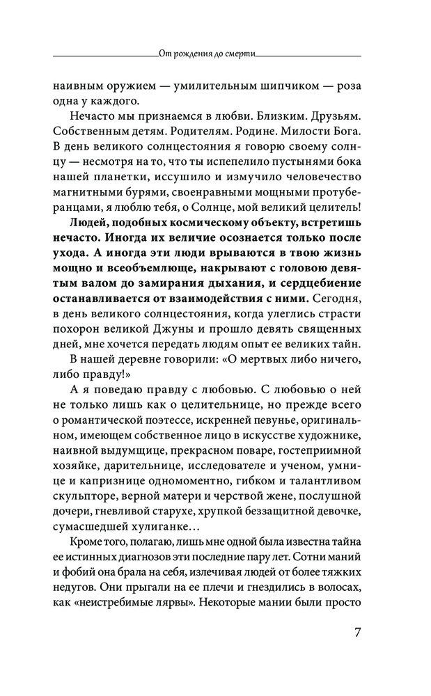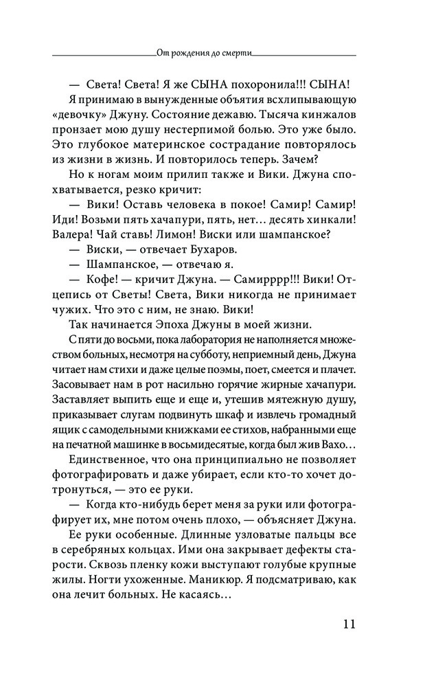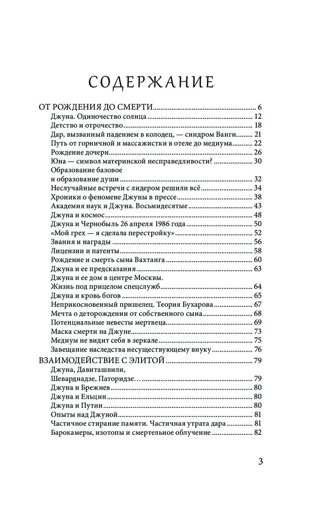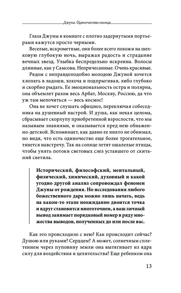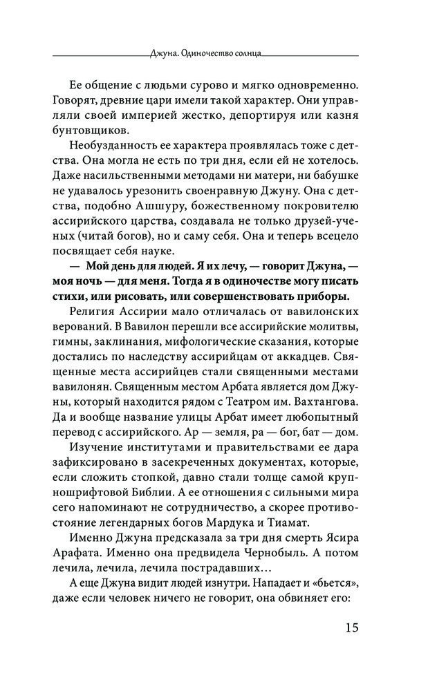 уникального феномена необузданной, нереальной, талантливой Джуны. Почему Джуна никогда не горевала о дочери? О потере близнецов? Почему так фанатично любила сына? Кто такой Давиташвили, и был ли он на самом деле? Какое в действительности базовое образование почетного академика 132 академий? Чудеса, увиденные во сне и наяву. Раскрытие всего спектра талантов феномена Джуны. Уникальные ассирийские рецепты для долгой и здоровой жизни. Тайны бесконтактного массажа. Уникальные советы для людей, чьи родственники подвержены сенильной деменции — мании того, что все окружающие их обворовали. Реабилитация равновесия через убирание эмоций. Джуна — как сосуд, в котором уживалось добро и зло, гнездились ангелы и демоны. Талант страдать. И дар любить. Джуна, как целительница.