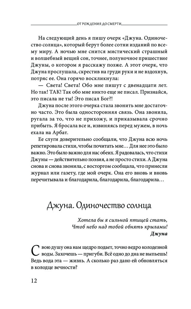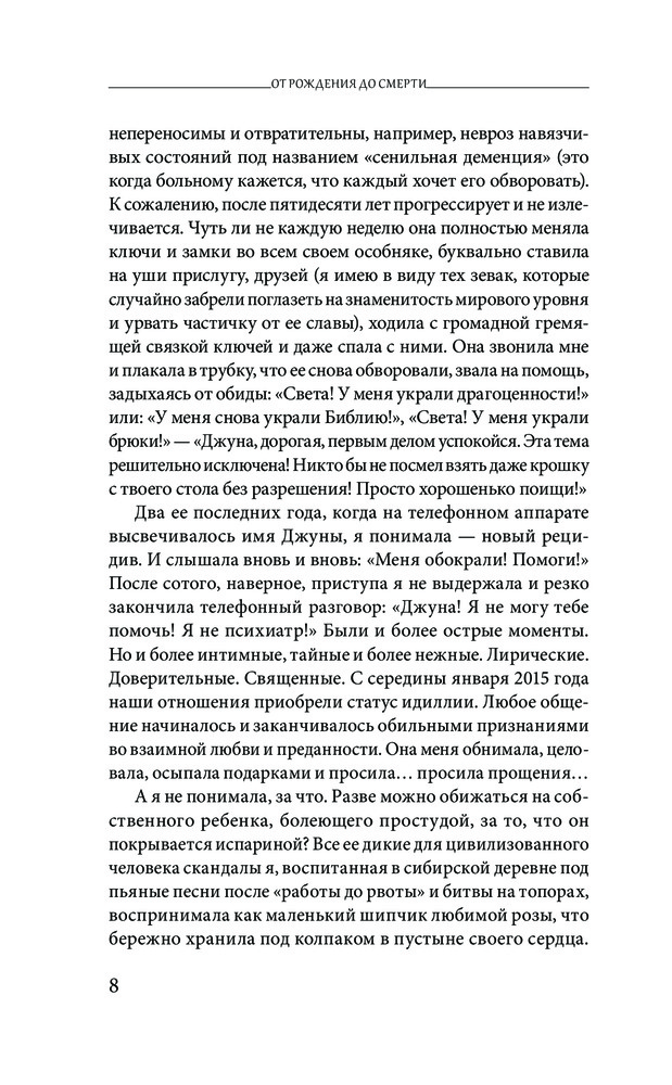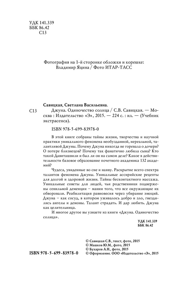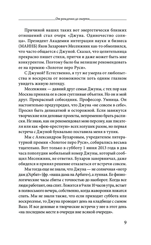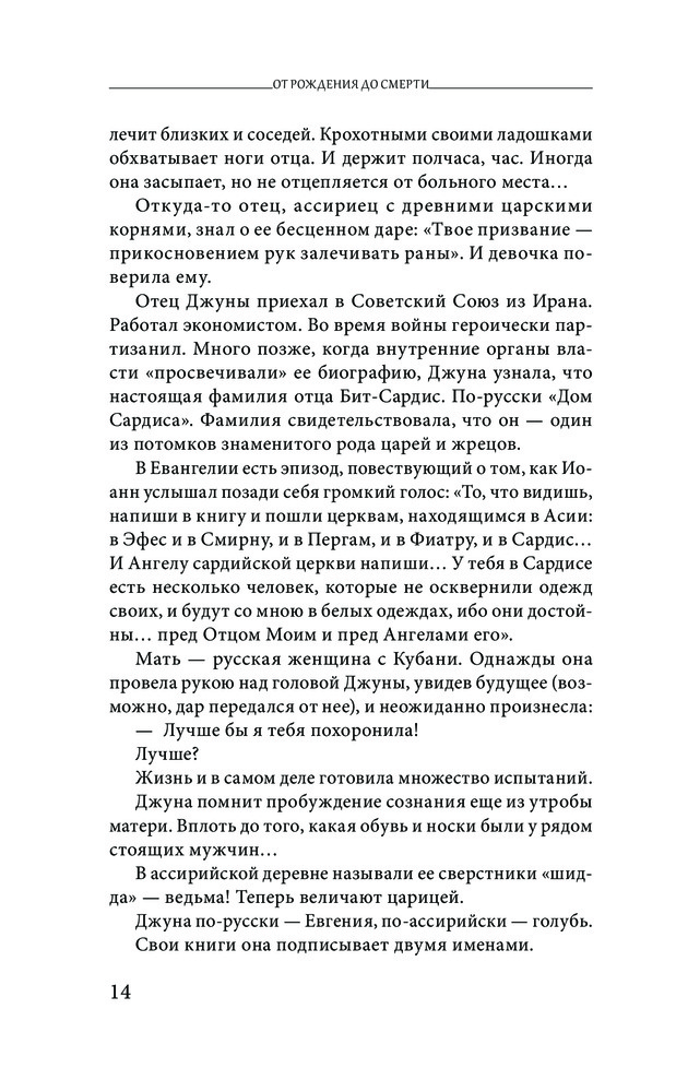 уникального феномена необузданной, нереальной, талантливой Джуны. Почему Джуна никогда не горевала о дочери? О потере близнецов? Почему так фанатично любила сына? Кто такой Давиташвили, и был ли он на самом деле? Какое в действительности базовое образование почетного академика 132 академий? Чудеса, увиденные во сне и наяву. Раскрытие всего спектра талантов феномена Джуны. Уникальные ассирийские рецепты для долгой и здоровой жизни. Тайны бесконтактного массажа. Уникальные советы для людей, чьи родственники подвержены сенильной деменции — мании того, что все окружающие их обворовали. Реабилитация равновесия через убирание эмоций. Джуна — как сосуд, в котором уживалось добро и зло, гнездились ангелы и демоны. Талант страдать. И дар любить. Джуна, как целительница.