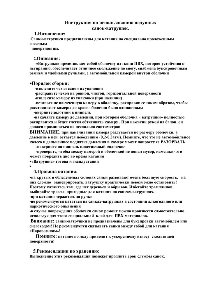 Будьте осторожны и соблюдайте правила безопасности при катании! На крутом склоне санки способны развивать скорость до 70 км/ч! Не подвергайте их воздействию открытого огня или мощных обогревательных приборов!