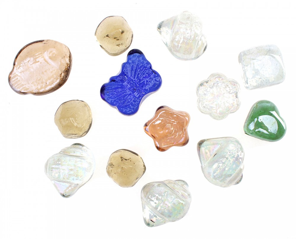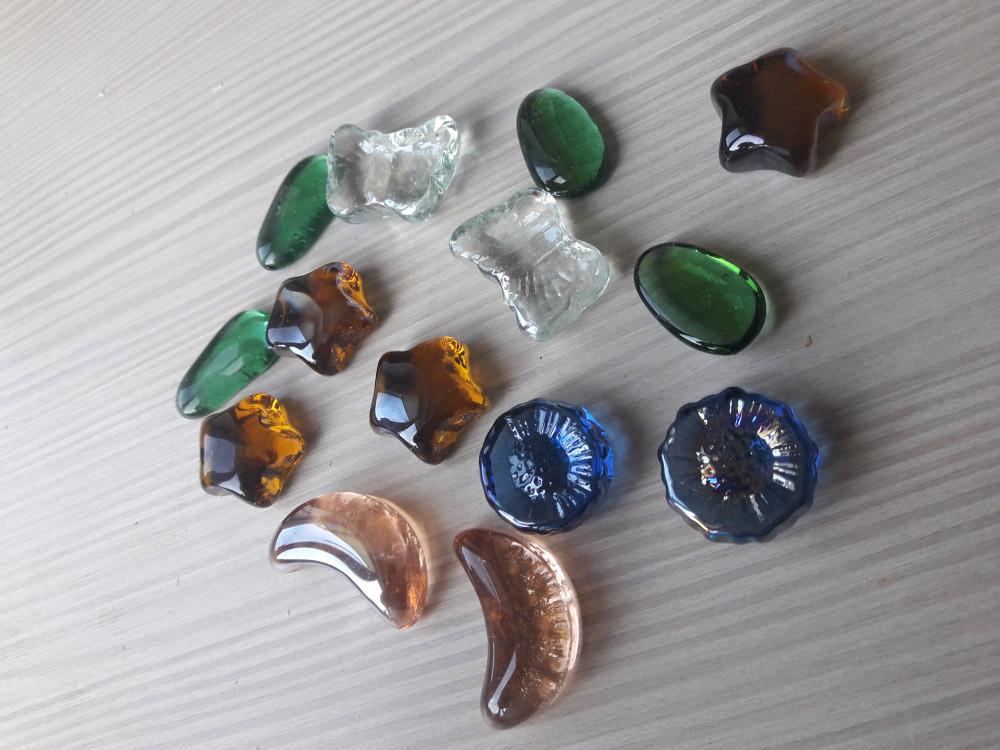 В наборе было 16 камушков - звезды, месяцы, бабочки, цветы и овалы. Размер каждого около 2-3 на 1.5-2 см. Красивые. Взяла в качестве сокровищ для игр в пирата.
