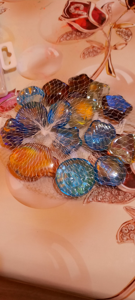 Камешки выложила на дно аквариума. Они прозрачные, но оттенки разные, один камень черного цвета. Очень красиво смотрятся.