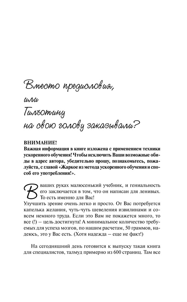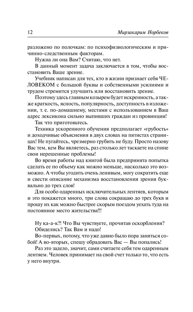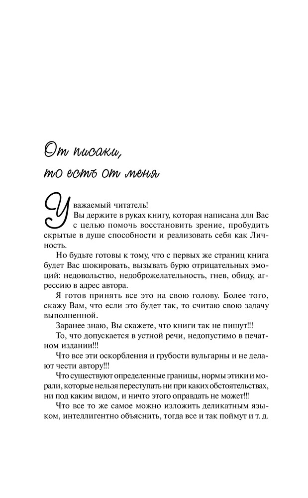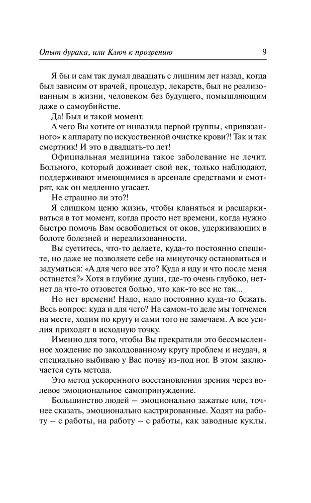 Книга написана очень простым языком. Легкие ненавязчивые советы заставляют по другому смотреть на жизнь. Стиль написания очень отличается от других авторов, иногда что-то очень цепляет и где-то возмущает, но хочется читать дальше. Уже воспользовалась многими советами. Думаю, что свое зрение я восстановлю с помощью этого автора.