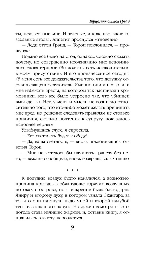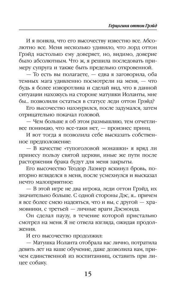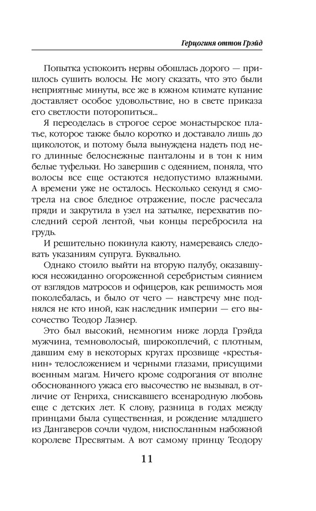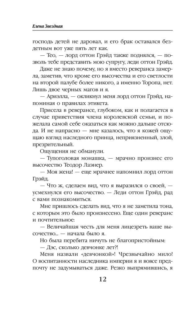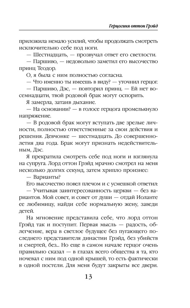 Тайна проклятого герцога. Книга вторая. Герцогиня оттон ГрэйдВ данный момент этот товар отсутствует в продаже. Возможно, у нас найдется аналогичный или похожий товар здесь. Серия: Колдовские миры Одно из самых внушительных состояний в империи, преданность духов, что подчиняются лишь сильнейшим, чёрная магия и отвратительный, лишенный даже намека на справедливость жестокий нрав — истинная и в целом неприглядная правда о моем супруге. Думала ли я, что всё может стать ещё сложнее? Мне стоило учесть наличие могущественных врагов. Но выбор сделан и наступили странные времена, когда наставники становятся врагами, и более не ведаешь, кому доверять, когда раскрываются подробности изощренного заговора и жизнь висит на волоске, а вместе со страхом и отчаянием в сердце врывается любовь, чтобы навсегда изменить мою жизнь, жизнь той, что отныне носит титул герцогини оттон Грэйд. |