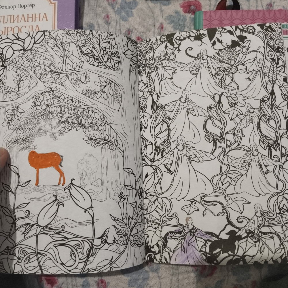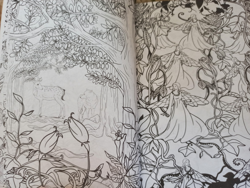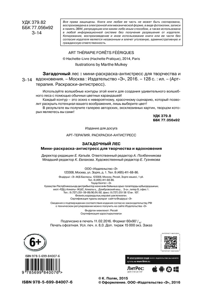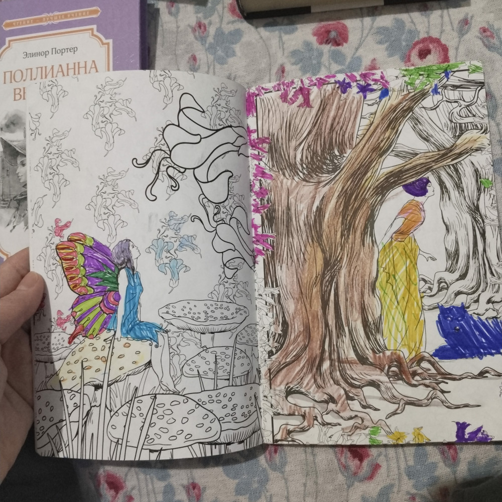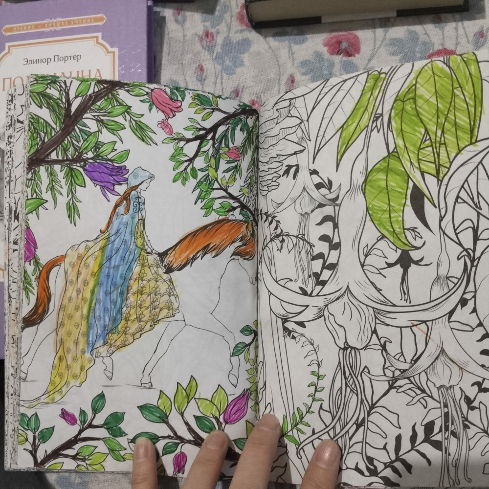 Загадочный лес: мини-раскраска-антистресс для творчества и вдохновения (ART THÈRAPIE FORÊTS FÈÈRIQUES) Количество страниц: 128 Мечтала раскрасить эту картинку, как только впервые увидела ее в интернете. Получилось очень мило. Камера смартфона, конечно, не передает реальные цвета полностью, но они близки к оригиналу, только чуть теплее и насыщеннее. Сама раскраска очень интересная. Много леса, цветов, сказочных существ, узоров, кельтской тематики. Формат издания небольшой, поэтому есть очень мелкие детали, есть средние и крупные, в зависимости от сюжета. Раскраска предназначена для раскрашивания карандашами. Листы довольно плотные и лощеные, печать четкая. Издание мне очень понравилось. Волшебный мир будто оживает, наполняясь красками картин моей собственной фантазии. Использованные материалы: акварельные карандаши “KOH-I-NOOR HARDMUTH Mondeluz”, акварельные карандаши «Белые ночи», цветные карандаши “Kid’s Fantasy”, стирательная резинка “KOH-I-NOOR”. Небольшой совет от меня: подкладывайте бумагу под страницу, которую раскрашиваете, чтобы рисунок на обратной стороне не отпечатывался на других иллюстрациях. Еще немного об издании: Москва: Эксмо, 2022. : ил. - (Арт-терапия. Раскраски-антистресс). Иллюстратор: Марте Мулки (Illustrations by Marthe Mulkey)
