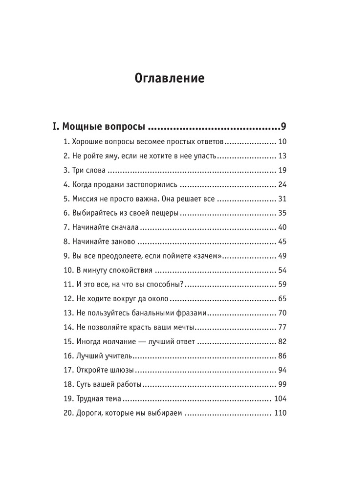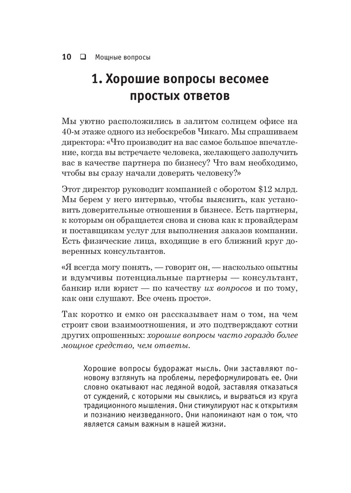 В издание включена подборка подлинных бесед с президентами, клиентами, коллегами, друзьями. Каждая история иллюстрирует необычайную действенность и влияние острых, заставляющих задуматься вопросов. Чтобы помочь читателям ориентироваться в море профессиональных задач, в конце книги приведены около 300 дополнительных мощных вопросов.