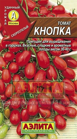 Аэлита Семена. Томат «Кнопка», 0.05 гВ данный момент этот товар отсутствует в продаже. Возможно, у нас найдется аналогичный или похожий товар здесь. Серия: Удачный урожай Пригоден для выращивания в горшках. Вкусные, сладкие плоды весом 30-40 г. |