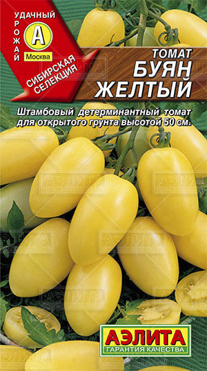 Аэлита Семена. Томат «Буян желтый», 0,1 гВ данный момент этот товар отсутствует в продаже. Возможно, у нас найдется аналогичный или похожий товар здесь. Серия: Удачный урожай Сорт сибирской селекции, с высокой выносливостью к неблагоприятным погодным условиям. Предназначен для выращивания в открытом грунте. Среднеспелый, вступает в плодоношение на 110-115-й день от всходов. Формирует крепкие, штамбовые растения высотой около 50 см с детерминантным типом роста. Томаты в компактных кистях по 5-7 штук. Плоды цилиндрические, ровные, гладкие, плотные, с небольшим количеством семян. Масса плода 60-120 г (до 150), вкус приятный, сладкий с кислинкой. Томаты хорошо дозариваются и отлично хранятся. Рекомендуются в основном для свежего потребления; но пригодны и для маринования – не лопаются, красиво смотрятся в составе цветных смесей. Урожайность 2-5 кг/м2. |