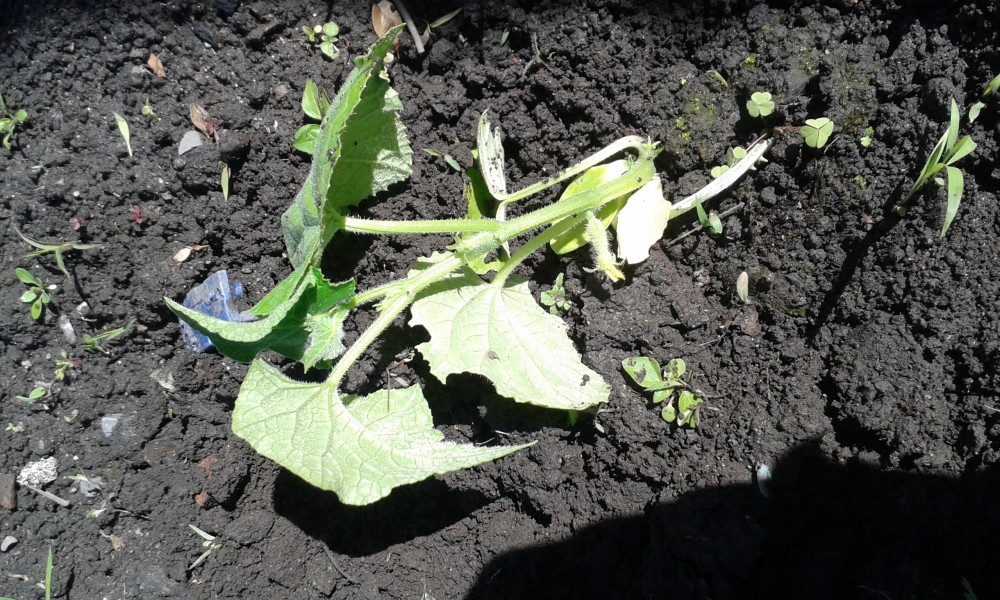 Посеяла в начале марта. Высадила рассаду в грунт в начале апреля. Так как алматинская весна в этом году холодная и дождливая, держу ростки под пластиковыми бутылками. Открыла для фотосессии)). Уже есть цветочки с завязью.