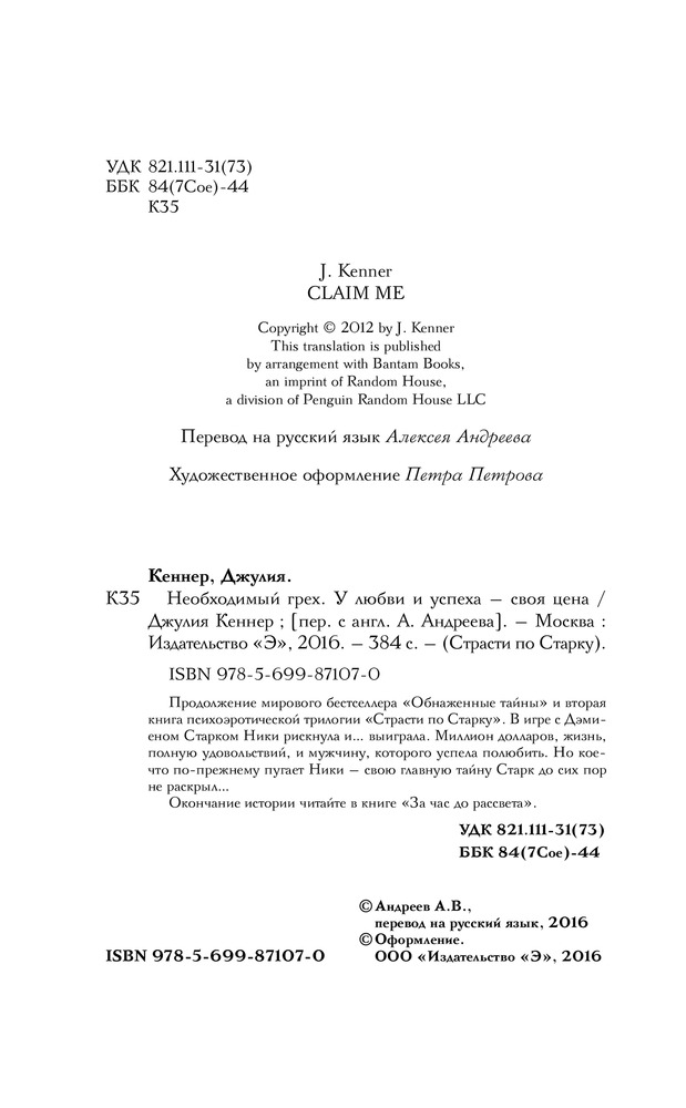 Необходимый грех. У любви и успеха - своя ценаВ данный момент этот товар отсутствует в продаже. Возможно, у нас найдется аналогичный или похожий товар здесь. Серия: Страсти по Старку В игре с Дэмиеном Старком Ники рискнула и… выиграла. Миллион долларов, жизнь, полную удовольствий, и мужчину, которого успела полюбить. Но кое-что по-прежнему пугает Ники: свою главную тайну Старк по-прежнему не раскрыл… |