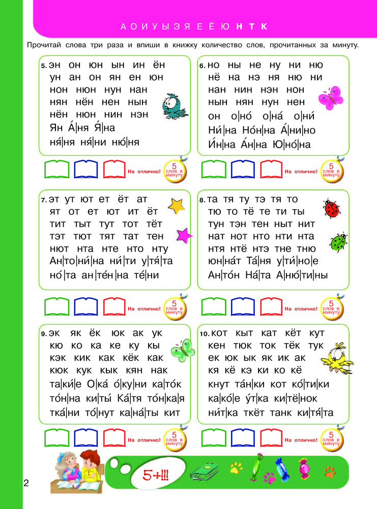 В данный момент этот товар отсутствует в продаже. Возможно, у нас найдется аналогичный или похожий товар здесь. Серия: 3000 примеров Учебное пособие «Быстрое обучение чтению» основано на эффективной методике обучения чтению известных педагогов-практиков О. В. Узоровой и Е. А. Нефёдовой. Цель книги — помочь ребенку объединять буквы в слоги, а слоги в слова, и научиться читать в определенном темпе, то есть автоматизировать навык чтения. Особенностью этого издания являются крупный шрифт и слова, разбитые на слоги. Для достижения отличного результата ребенок должен прочитать материал три раза. После каждого прочтения он вписывает количество слов в книжку. Родители отмечают, сколько времени необходимо ребенку для прочтения. Проверить результат можно по значку-медальке (это результат, к которому нужно стремиться). С каждой страницей книги число слов в минуту увеличивается, а значит, у ребенка возрастает скорость чтения. А кто быстро читает, тот быстро мыслит! Книга не только поможет ребенку научится читать, развивать речь и обогатить словарный запас, но и привьет любовь к чтению. |