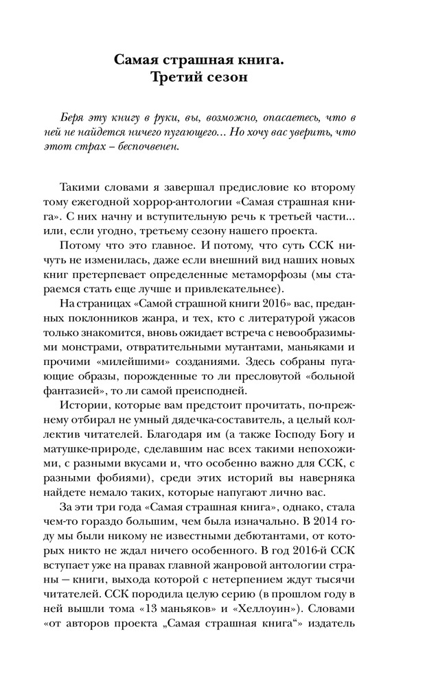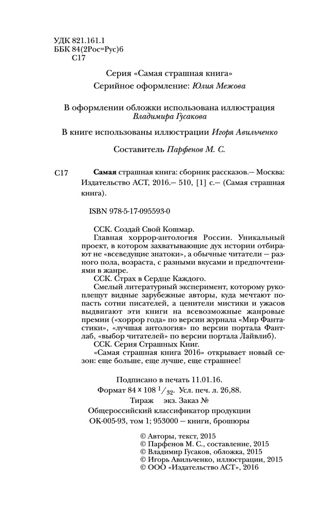 Самая страшная книга 2016В данный момент этот товар отсутствует в продаже. Возможно, у нас найдется аналогичный или похожий товар здесь. Серия: Самая страшная книга ССК. Создай Свой Кошмар. |