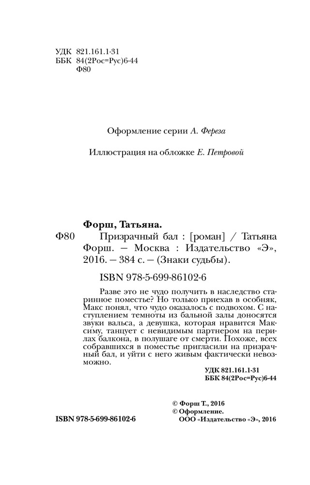 Призрачный балВ данный момент этот товар отсутствует в продаже. Возможно, у нас найдется аналогичный или похожий товар здесь. Серия: Знаки судьбы Разве это не чудо получить в наследство старинное поместье? Но, только приехав в особняк, Макс понял, что чудо оказалось с подвохом. С наступлением темноты из бальной залы доносятся звуки вальса, а девушка, которая нравится Максиму, танцует с невидимым партнером на перилах балкона, в полушаге от смерти. Похоже, всех собравшихся в поместье пригласили на призрачный бал, и уйти с него живым фактически невозможно. |