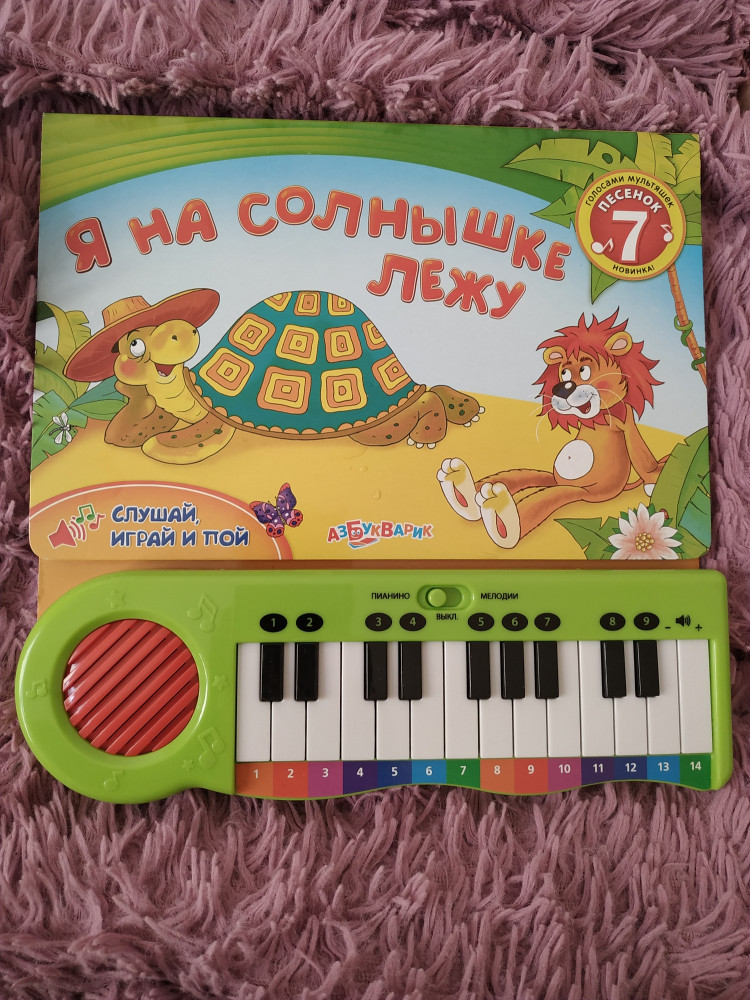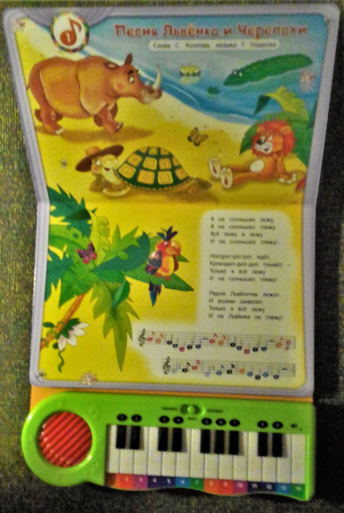 Замечательный развивающий и обучающий подарок для малыша - книжка-пианино "Я на солнышке лежу" из серии : "Слушай , играй и пой". В комплект входят две батарейки типа AAA 1.5V . На обратной стороне книги приводится перечень песенок(всего 7) и инструкция пользователя . 14 белых клавиш и 9 черных пронумерованы и имеют вспомогательную цветовую окраску ,что облегчает обучение игре . Книга-пианино очень понравилась внуку ! Покупкой доволен . Спасибо ! рекомендую.