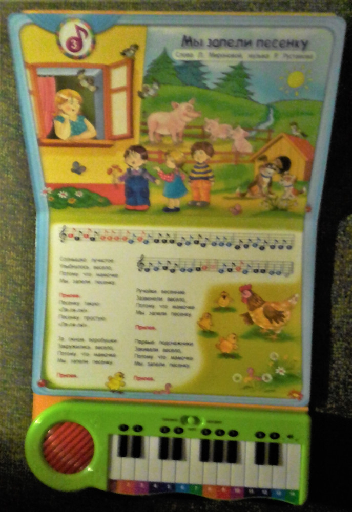 Посмотрите обзор в you tube. Хорошая книжка. Своих денег стоит. Брала для дочери 2летней. Пока сыграть по нотам не сможет. Но в будущем имеется возможность сыграть мелодию самому по подсказкам.