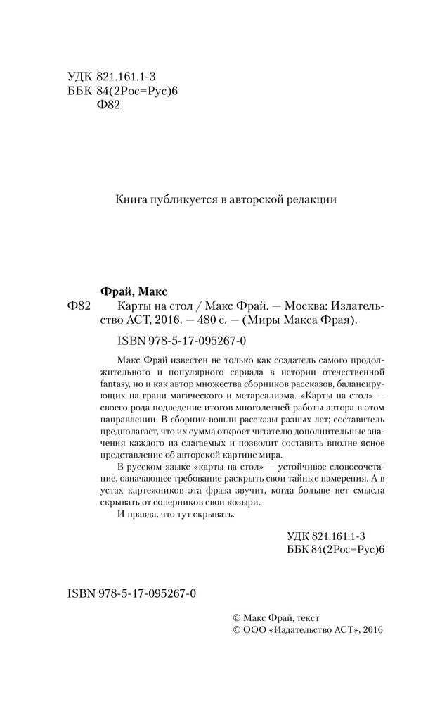 Серия: Миры Макса Фрая Макс Фрай известен не только как создатель самого продолжительного и популярного сериала в истории отечественной fantasy, но и как автор множества сборников рассказов, балансирующих на грани магического и метареализма. «Карты на стол» — своего рода подведение итогов многолетней работы автора в этом направлении. В сборник вошли рассказы разных лет; составитель предполагает, что их сумма откроет читателю дополнительные значения каждого из слагаемых и позволит составить вполне ясное представление об авторской картине мира. |