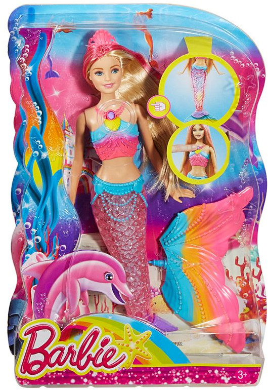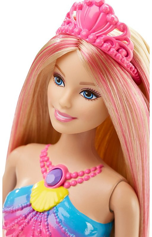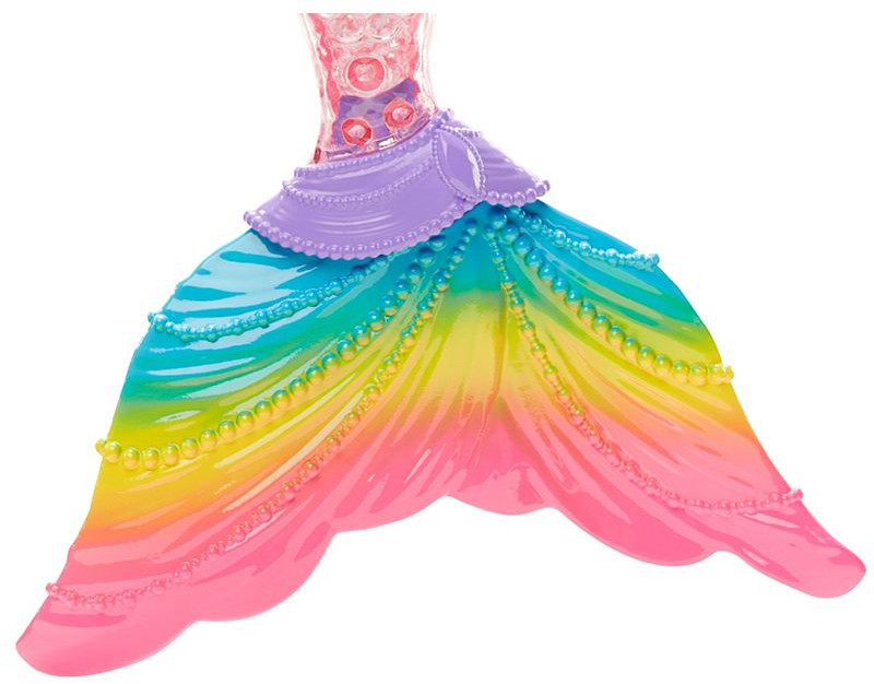 Неотразимая Барби стала принцессой подводного мира. Короткий топ подчеркивает достоинства фигуры куклы, а безупречный макияж является ее визитной карточкой. Ее густые волосы с розовыми прядями украшает жемчужная розовая диадема, а цвет топа плавно переходит из цвета морской волны в оттенок кораллового рифа. Красивый радужный хвост русалки может играть нежными переливами, когда она плавает в океане или наслаждается лучами солнца на берегу. Для этого достаточно нажать на кнопку на ожерелье.