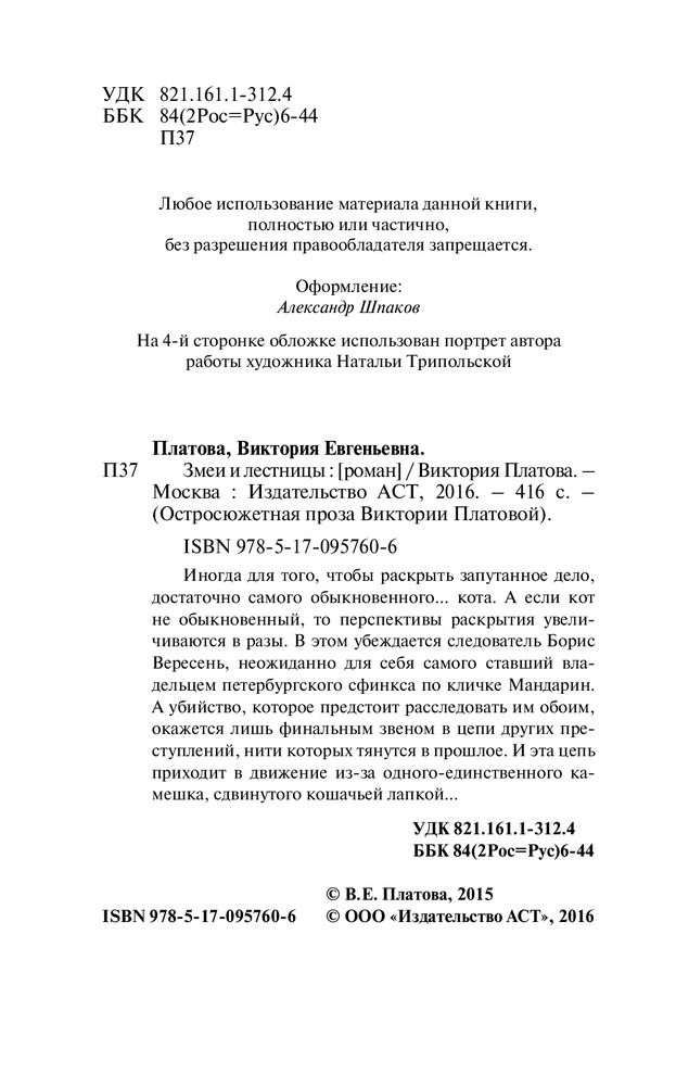 В данный момент этот товар отсутствует в продаже. Возможно, у нас найдется аналогичный или похожий товар здесь. Серия: Остросюжетная проза Виктории Платовой Иногда для того, чтобы раскрыть запутанное дело достаточно самого обыкновенного кота. А если кот — необыкновенный, то перспективы раскрытия увеличиваются в разы. В этом убеждается следователь Борис Вересень, неожиданно для себя самого ставший владельцем петербургского сфинкса по кличке Мандарин. А убийство, которое предстоит расследовать им обоим, окажется лишь финальным звеном в цепи других преступлений, нити которых тянутся в прошлое. И эта цепь приходит в движение из-за одного-единственного камешка, сдвинутого кошачьей лапкой. |