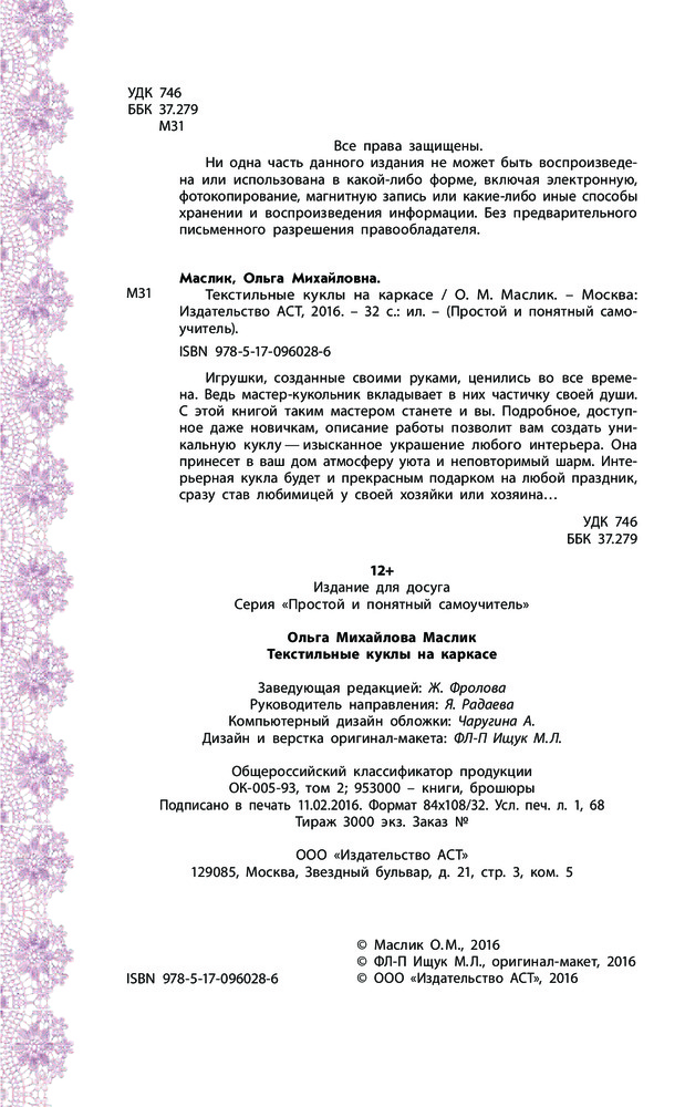 В данный момент этот товар отсутствует в продаже. Возможно, у нас найдется аналогичный или похожий товар здесь. Серия: Простой и понятный самоучитель Текстильные куклы на каркасе стали одним из главных украшений интерьера в современном мире. Они создают уют и придают неповторимый шарм месту, в котором находятся. Такую уникальную куклу можете создать и вы сами, при помощи мастер-классов в этой книге. Пошаговые иллюстрации и выкройки в натуральную величину станут прекрасными помощниками в создании домашних ангелов и фей. Поселите частичку волшебства и теплоты в своем доме, создав уникальное интерьерное украшение — куклу на каркасе! |