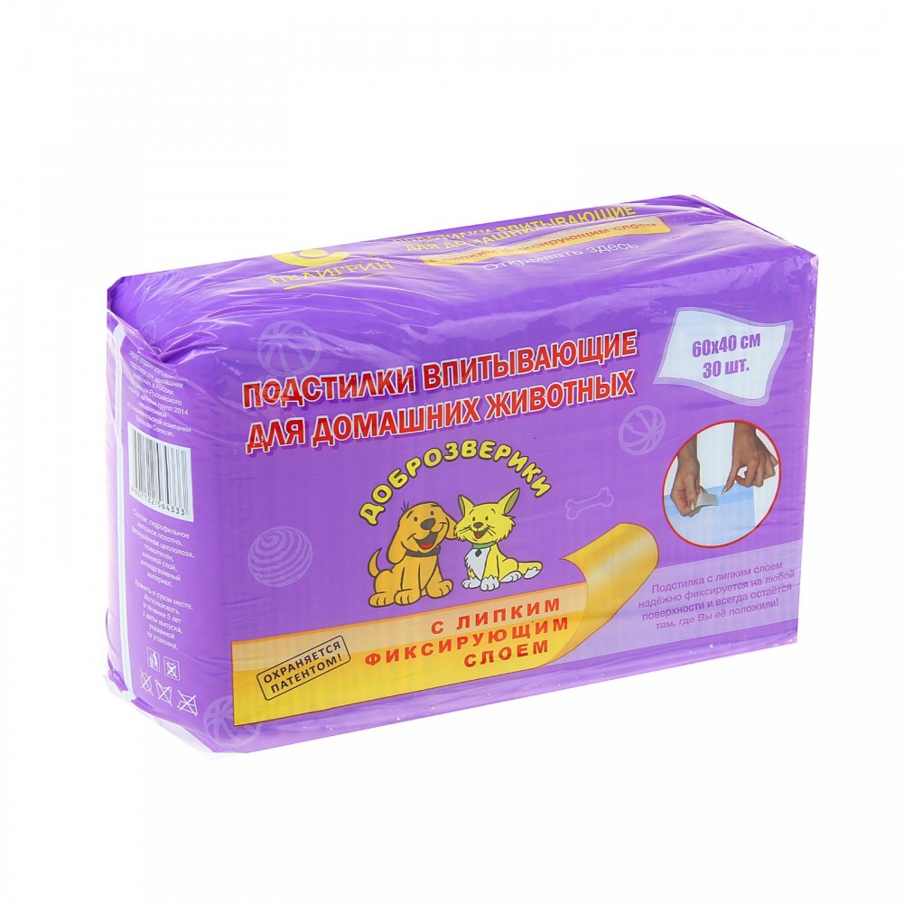 Доброзверики Подстилки впитывающие для животных 60х40см с липким фиксирующим слоем, 30 шт