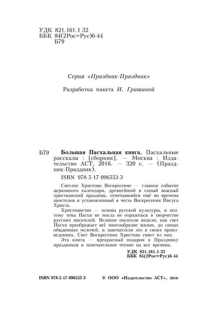 Большая Пасхальная книга. Пасхальные рассказыВладимир Галактионович Короленко, Антон Павлович Чехов, Александр Иванович Куприн В данный момент этот товар отсутствует в продаже. Возможно, у нас найдется аналогичный или похожий товар здесь. Серия: Праздник-Праздник Светлое Христово Воскресение — главное событие церковного календаря, древнейший и самый важный христианский праздник, отмечавшийся ещё во времена апостолов и установленный в честь Воскресения Иисуса Христа. |