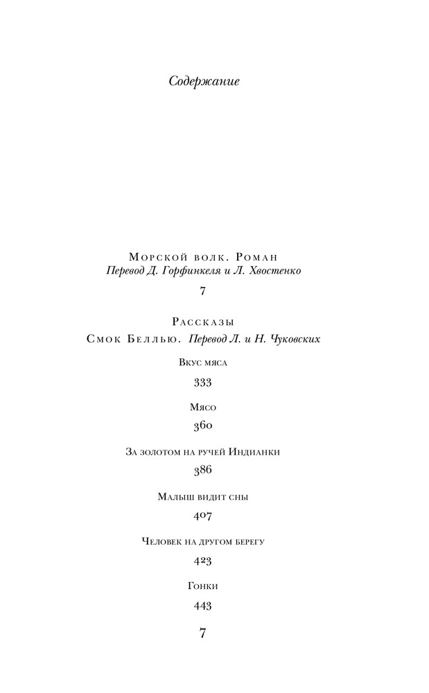 В романе «Морской волк» противоречивая фигура Волка Ларсена, капитана промысловой шхуны, жестокого и циничного моряка, способного легко убить человека — но вместе с тем одинокого философа, поклонника Теннисона и Шекспира — раскрывается на фоне описанных с большим мастерством и любовью опасных морских странствий. В увлекательных рассказах о золотой лихорадке Клондайка из циклов «Смок Беллью» и «Смок и Малыш» аляскинских старателей ждут самые разнообразные приключения, иногда забавные, иногда опасные и трагические. Но в любых обстоятельствах, от гонок на собачьих упряжках до плена у индейцев, герои не теряют мужества и присутствия духа.