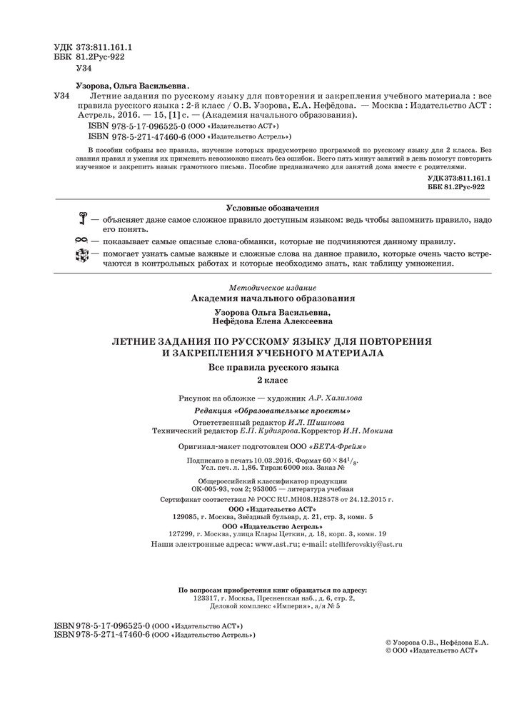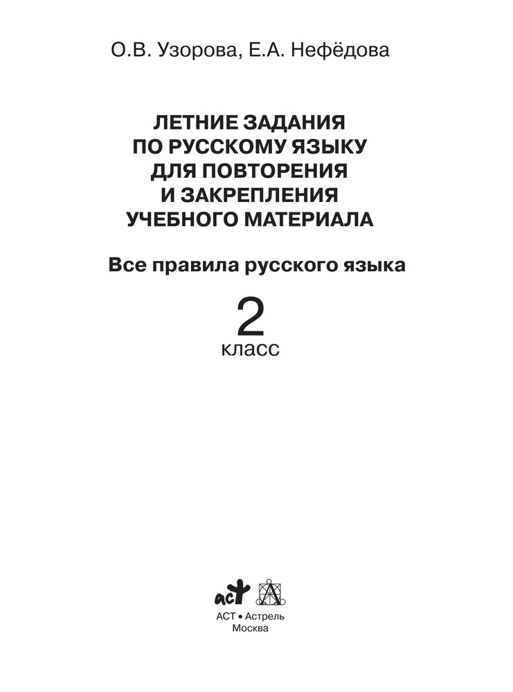 Летние задания по русскому языку для повторения и закрепления учебного материала. Все правила русского языка. 2 классОльга Васильевна Узорова, Елена Алексеевна Нефедова В данный момент этот товар отсутствует в продаже. Возможно, у нас найдется аналогичный или похожий товар здесь. Серия: Академия начального образования В пособии собраны все правила, необходимые для автоматического грамотного письма. Без знания этой теории невозможно написать без ошибок различные проверочные работы. В пособие вошли основные правила, представленные во всех федеральных учебниках по русскому языку для 2-го класса. |