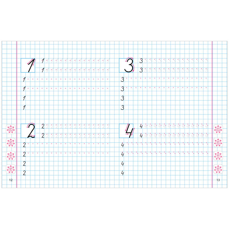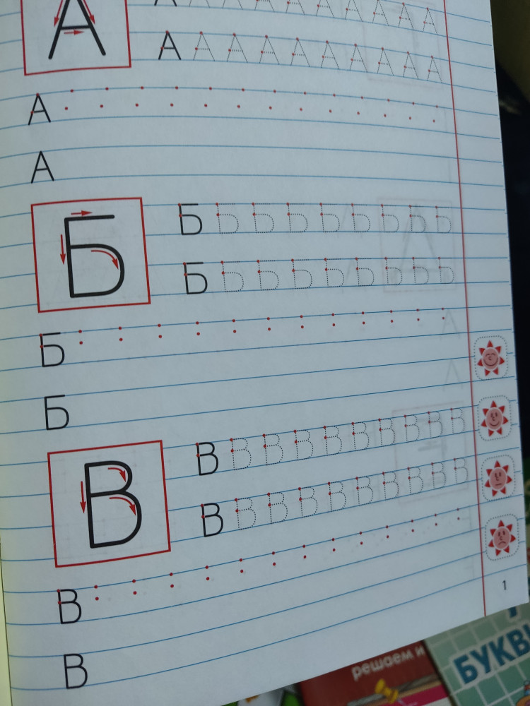 Хорошая пропись с указанием техники написания стрелочками букв и цифр, листы с буквами в широкую линейку, листы с цифрами в клетку, линейку и клетку видно отчетливо.