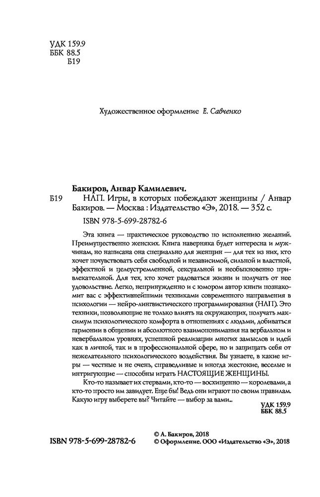 НЛП. Игры, в которых побеждают женщиныВ данный момент этот товар отсутствует в продаже. Возможно, у нас найдется аналогичный или похожий товар здесь. Серия: Психология общения В ваших руках — практическое руководство по исполнению желаний. Преимущественно женских. Книга наверняка будет интересна и мужчинам, но написана она специально для женщин — для тех из них, кто хочет почувствовать себя свободной и независимой" сильной и властной, эффектной и целеустремленной, сексуальной и необыкновенно привлекательной. Для тех, кто хочет радоваться жизни и получать от нее удовольствие. Легко, непринужденно и с юмором автор книги познакомит вас с эффективнейшими техниками современного направления в психологии — нейролингвистического программирования (НЛП). Это техники, позволяющие не только влиять на окружающих, получать максимум психологическою комфорта в отношениях с людьми, добиваться гармонии в общении и абсолютного взаимопонимания на вербальном и невербальном уровнях, успешной реализации многих замыслов и идей, как в личной, так и в профессиональной сфере, но и защищать себя от нежелательного психологическою воздействия. |