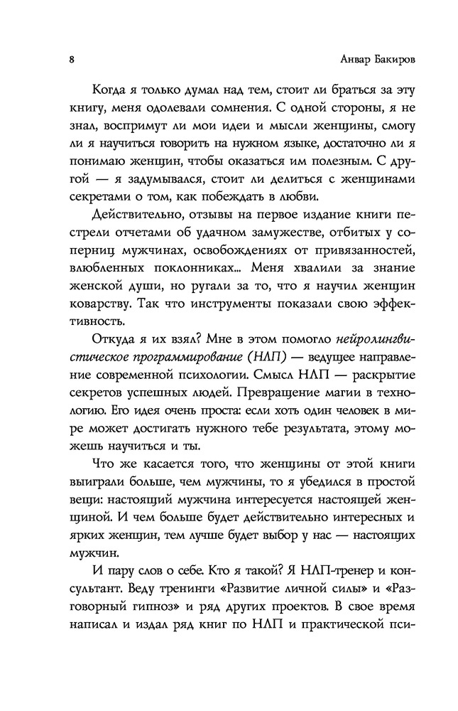 Очень интересная, очень полезная книга для женщин. Автор не только хорошо знает особенности взаимоотношений между мужчинами и женщинами, но и любит последних и искренне пытается научить их правилам игры в любовь. Читать всем женщинам! Очень рекомендую!