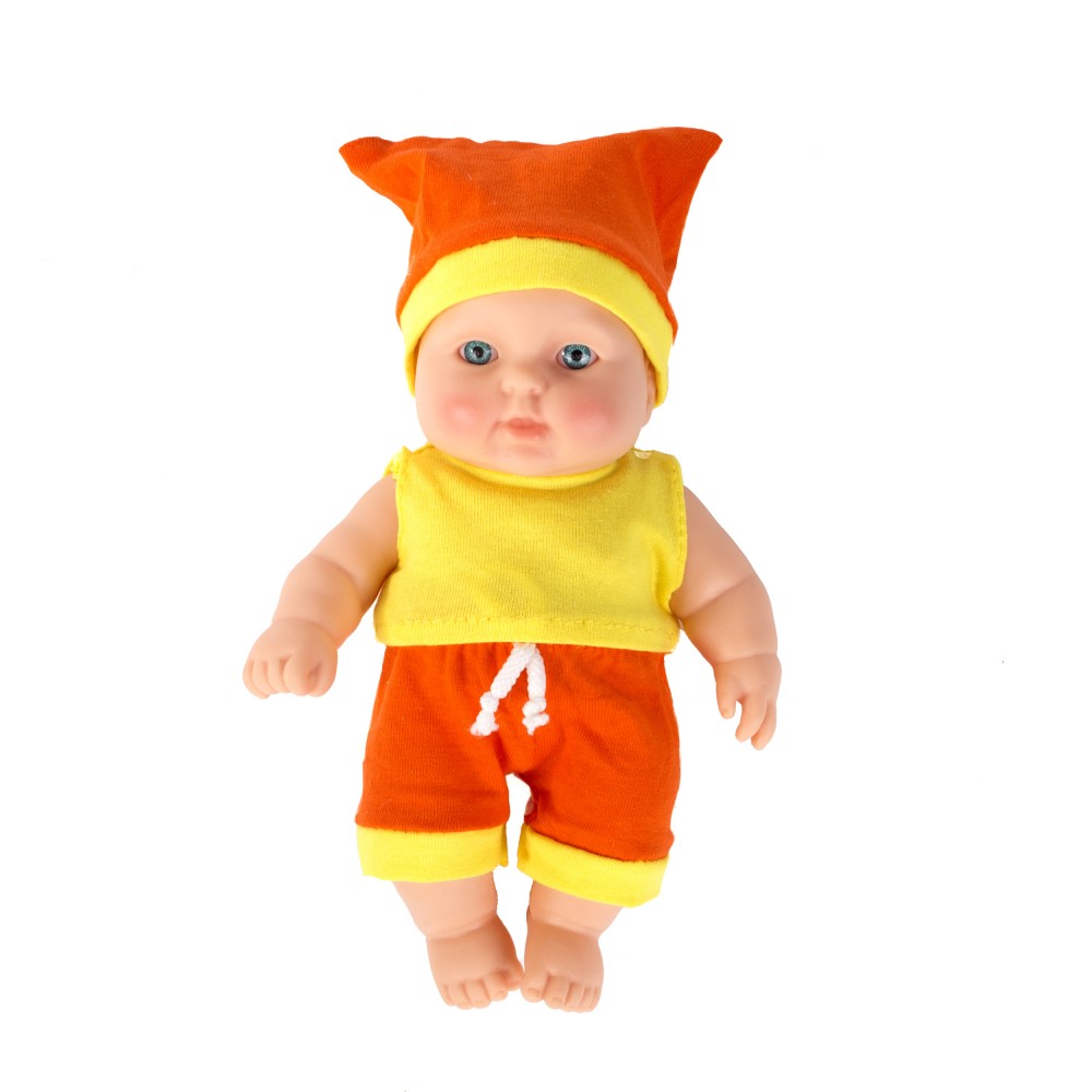 Высота 20 см. Тело куклы пропорционально и гармонично, полностью выполнены из эластичного приятного на ощупь винила. На Карапузе трикотажная футболка, штанишки и шапочка.