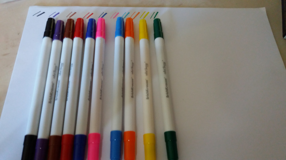 Хорошо пишут, под любым углом не царапают бумагу. Цвета яркие, насыщенные. Цвет довольно плотно ложится, не как у акварельных фломастеров.