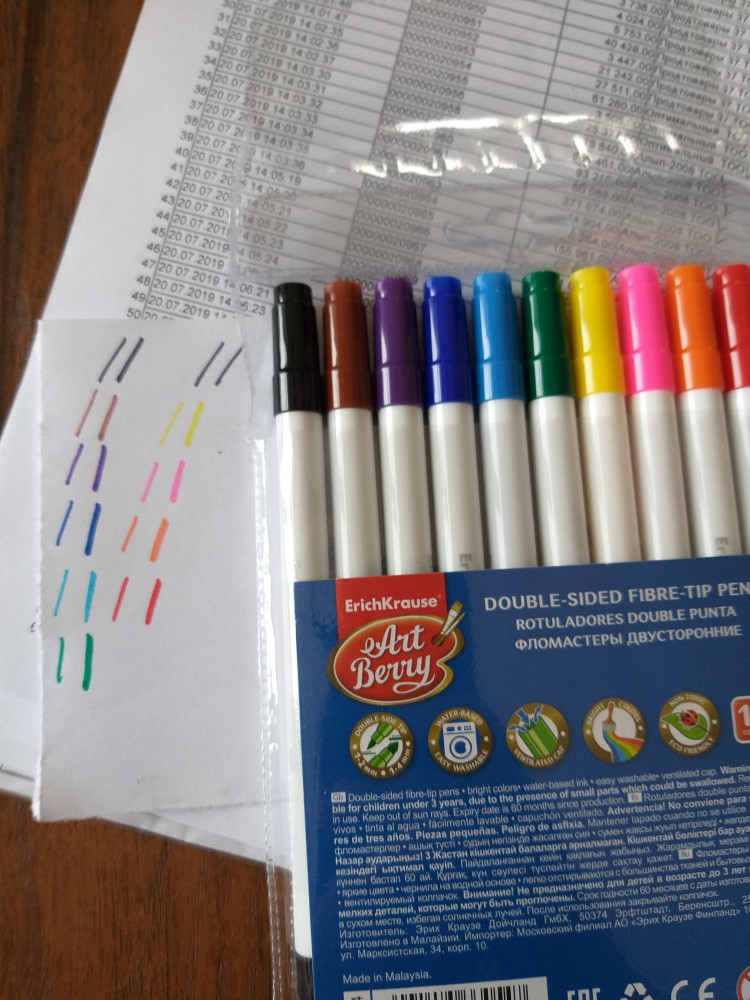 Фломастеры качественные, пишут ярко. С одной стороны толстый стержень для затушевки, с другой тонкий. Можно писать как ручкой. Дочь довольна!