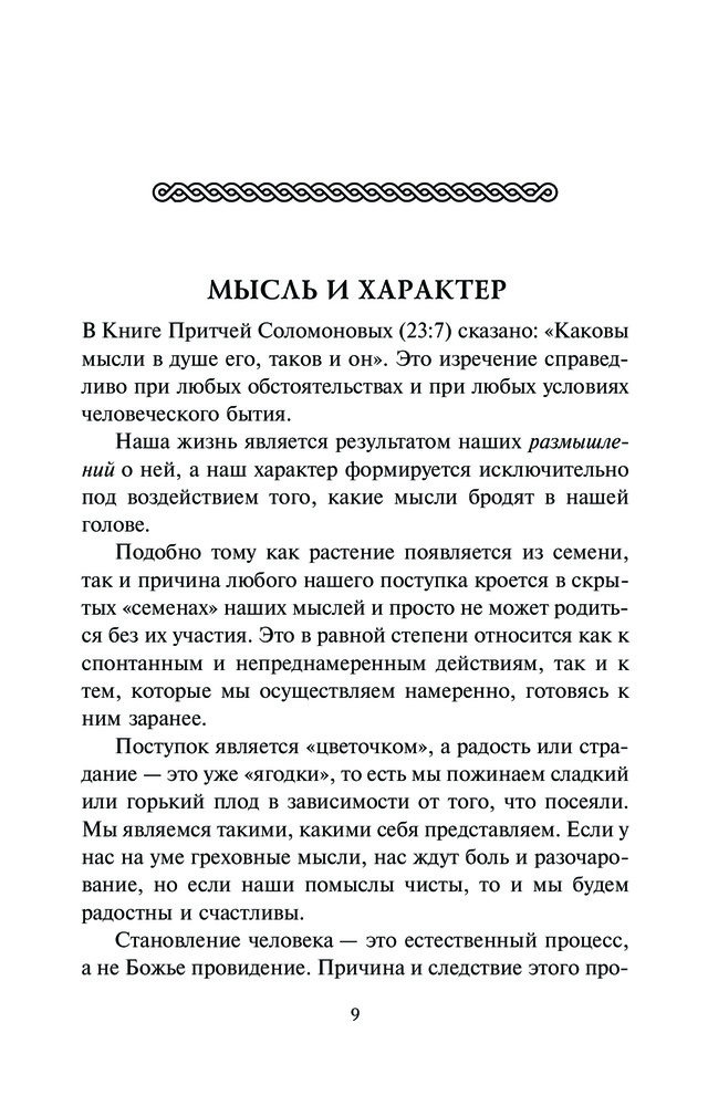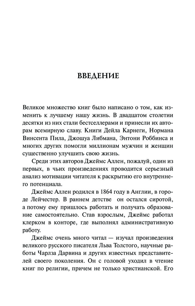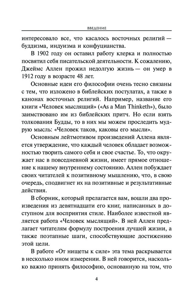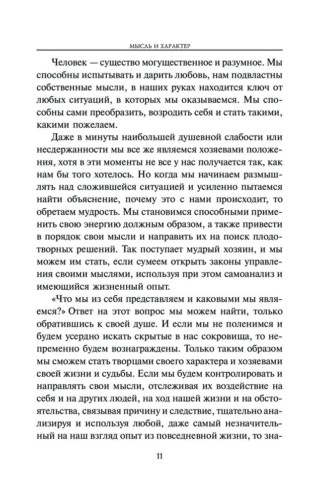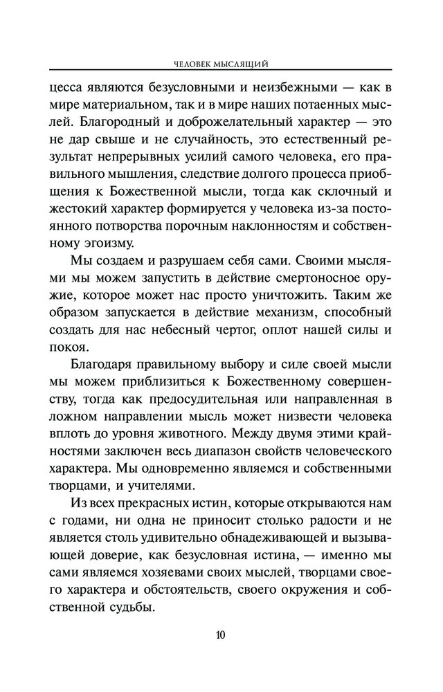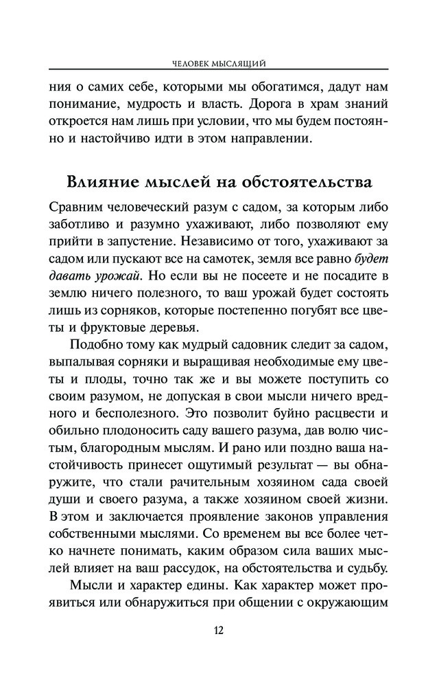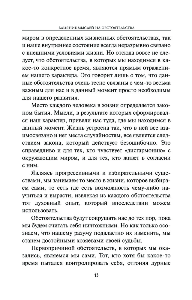 В целом книга хорошая, но дочитала только до середины. Понравилось, все что в нашей жизни происходит, обусловлены внутренним состоянием души, а не внешними факторами. Обстоятельства будут влиять на нас ровно настолько, насколько мы им это позволим. Вы позволяете себе зависеть от обстоятельств, поскольку у вас нет правильного представления о природе силы, которой обладают наши мысли. Приведите свои мысли в порядок!