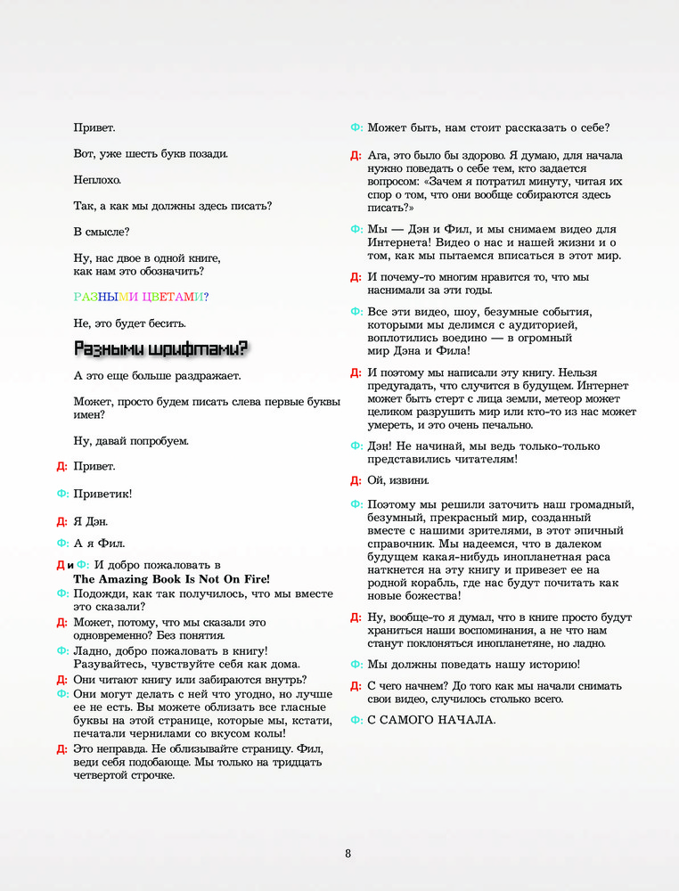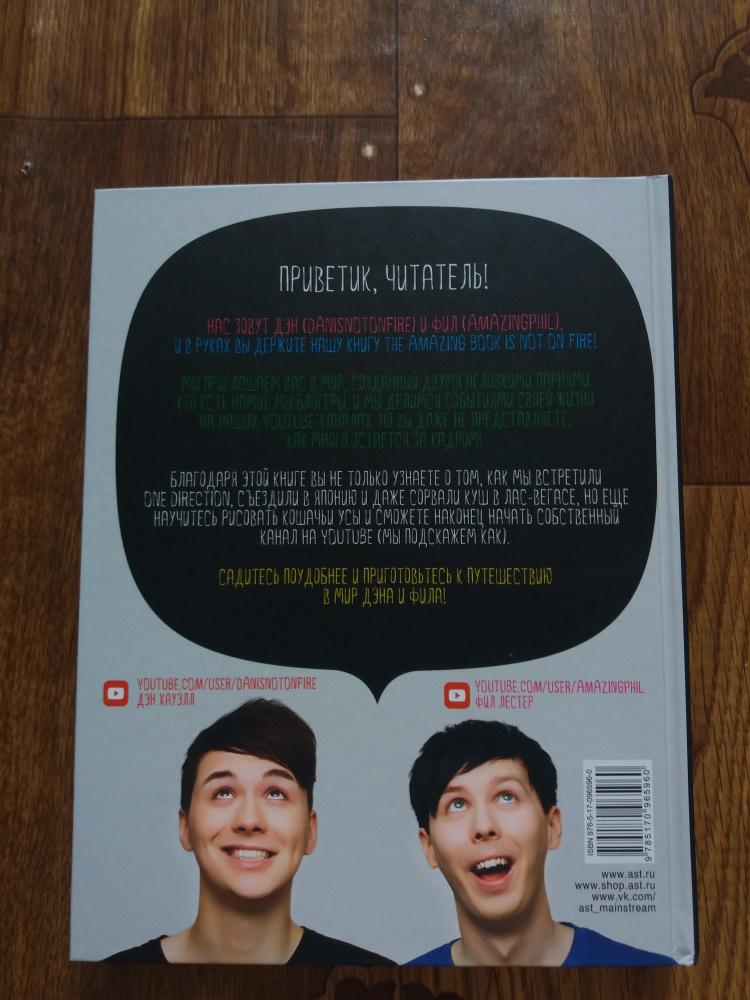 История YouTube-сенсаций Дэна и Фила. The Amazing Book Is Not On Fire!В данный момент этот товар отсутствует в продаже. Возможно, у нас найдется аналогичный или похожий товар здесь. В этой книге ты откроешь целый мир. Мир, созданный двумя неуклюжими парнями, которые рассказывают о своей жизни всему интернету. Ну, то есть, нами. |