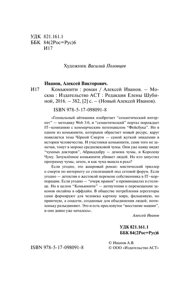 Серия: Новый Алексей Иванов «Гениальный айтишник изобретает „семантический интернет“ — методику Web 3:0, и „семантический“ портал порождает IT-компанию с коммерческим потенциалом „Фейсбука“. Но в одном из комьюнити, которыми обрастает новый ресурс, вдруг появляется тема Чёрной Смерти — самой жуткой эпидемии в истории человечества. И участники комьюнити, сами того не замечая, тонут в мороке средневековой чумы. Они уже наяву видят „чумных докторов“, Абракадабру — демона чумы, и Королеву Чуму. Зачумлённое комьюнити убивает людей. Но кто запустил программу чумы, зачем, и как чума вышла в реал? |