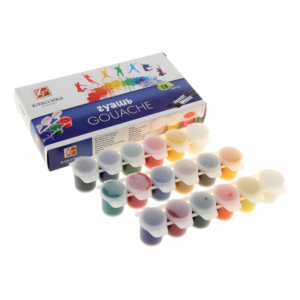 Гуашь «Классика», 18 цветов поможет вашему ребёнку создавать красивые яркие картинки, выдумывать невероятные сюжеты и воплощать их в реальность, развивая цветовое восприятие, зрительную память, воображение, мелкую моторику пальцев, ассоциативное, аналитическое и творческое мышление.